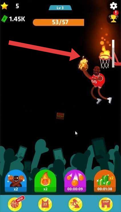 3、接近关卡目标(53/57)时,点击技能栏增益效果,让角色带火投篮,提升命中率,完成“Lv3”关卡,进入下一级。
