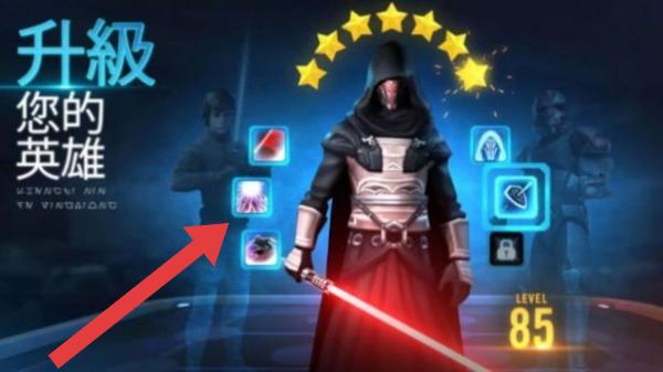 1、文字有“升級您的英雄”“LEVEL85(等级85)”,画面展示了一个身着黑袍、手持发光剑的英雄形象,周围有升级相关的图标,是角色扮演类英雄升级界面。