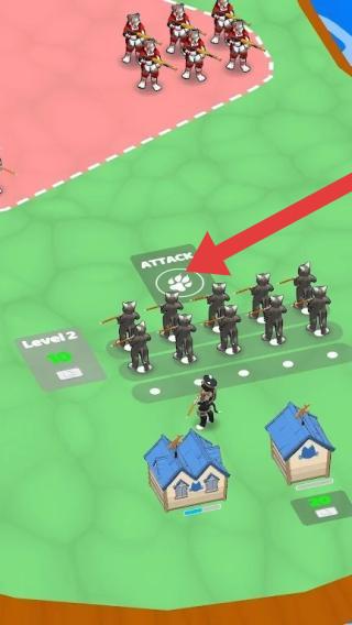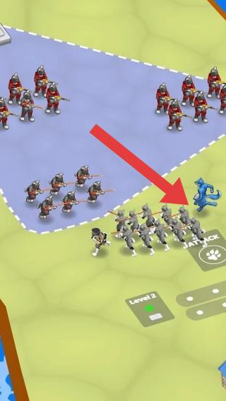 3、画面中有不同造型的士兵角色,存在“ATTACK”(攻击)按钮,还有标有“Level2”(2级)的标识,玩家需操控士兵点击攻击按钮来与敌方作战。