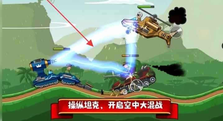 2、战斗中,操控坦克躲避敌方攻击(如直升机、敌方坦克),利用己方坦克武器(蓝色光束)攻击敌方载具,争取胜利。