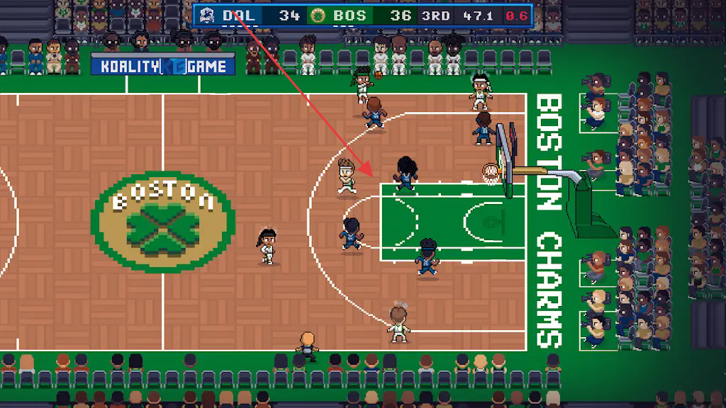 1、在比赛中,操控箭头指向的球员,通过虚拟摇杆移动,靠近篮筐区域,利用传球、突破,寻找投篮机会,注意防守球员站位。