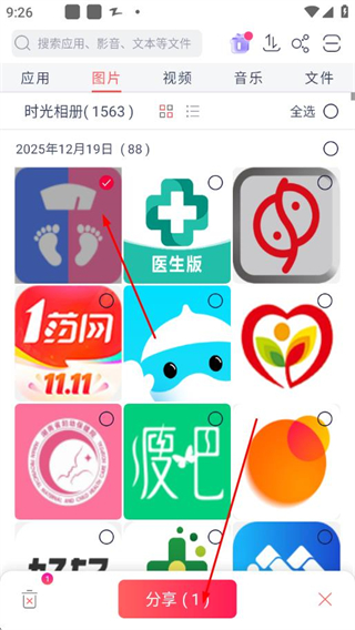 2、 在图片分类页面勾选需要传输的图片,点击页面底部的分享。
