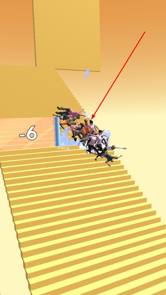 2、人群下楼梯时,会因碰撞、台阶摔倒,保持按住移动,让人群持续坠落,积累伤害值(如-6、-20)。