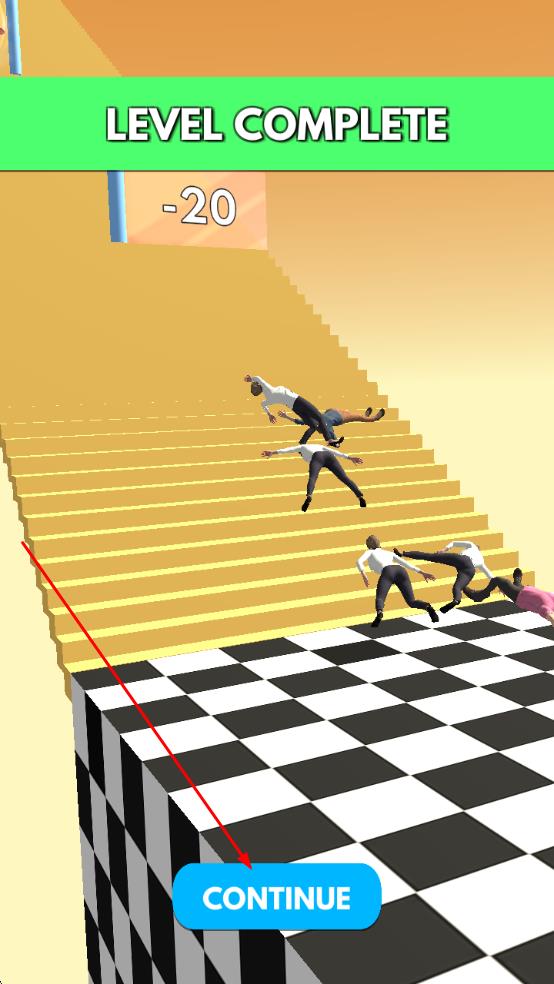3、人群到达黑白棋盘终点,显示【LEVEL COMPLETE】,点击【CONTINUE】,进入下一关,继续操控人群坠落闯关。