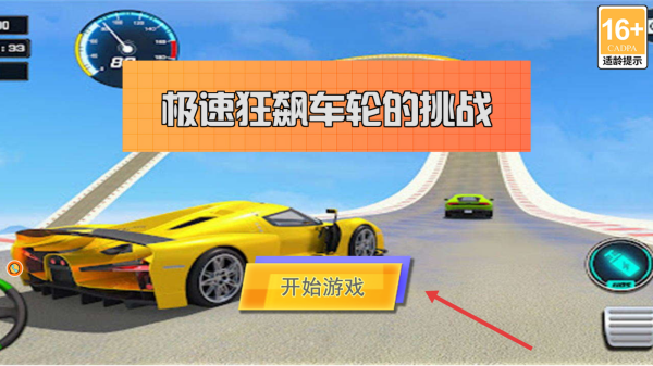 1、点击主界面【开始游戏】,进入《极速狂飙车轮的挑战》,开启赛车闯关,准备驾驶黄色超跑。