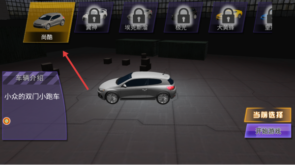 2、在车辆选择页,选【尚酷】(小众双门小跑车),点击【开始游戏】,确定该车辆进行挑战。