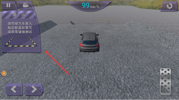 3、驾驶车辆时,按提示【请驾驶汽车落入指定框选位置完成跌落碰撞测试】,用按键控车,驶入框选区域。