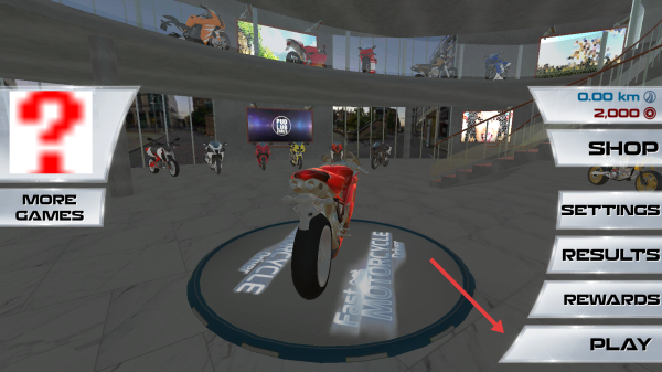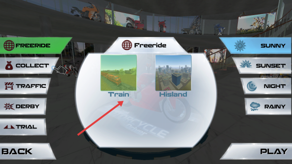 1、点击界面右侧【PLAY】,进入摩托驾驶游戏,选定红色摩托,开启自由骑行挑战。
