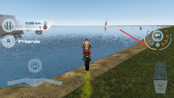 3、驾驶时,用屏幕按键控车,沿水边道路行驶,留意右侧仪表盘,保持平衡完成骑行。