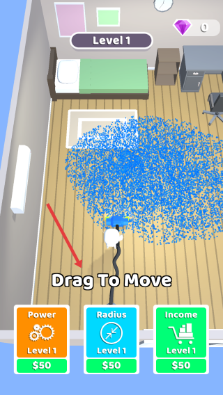 1、移动操作:手指拖动屏幕,控制手持吸尘器的白色小人,在房间场景中自由移动,规划吸尘路径。