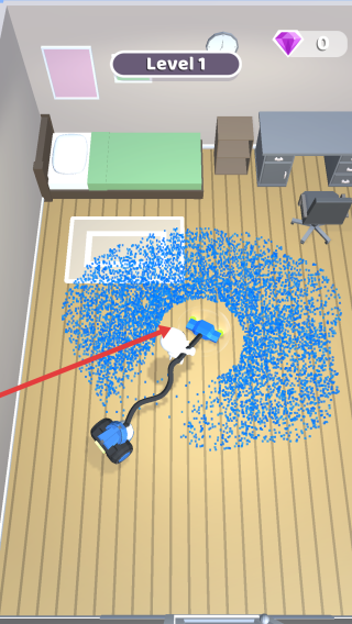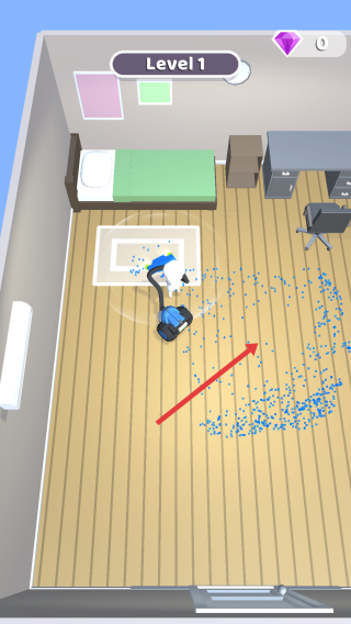 2、吸尘清理:让小人靠近蓝色灰尘堆,吸尘器自动吸纳灰尘,持续清理直至房间内灰尘全部吸完,完成当前关卡目标。
