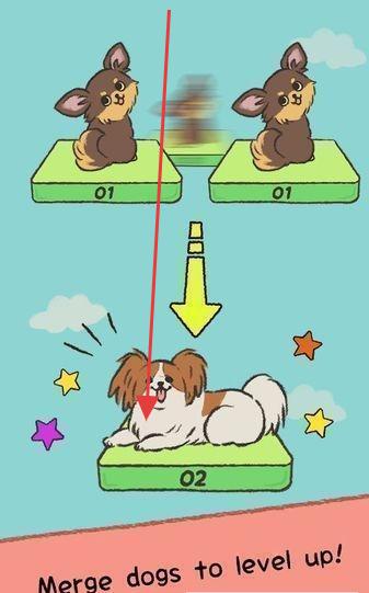 2、把相同编号的小狗,例如两只编号01的小狗,拖动到箭头指示位置进行合成,就能升级为更高阶的狗狗,如编号02。