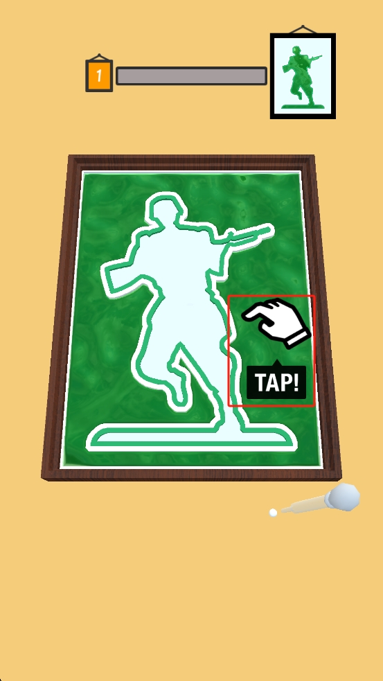 1、跟随指引点击“TAP!”区域,用工具按轮廓雕刻绿色粘土,参照上方士兵模型,逐步塑造形状,完成基础雕刻推进关卡。