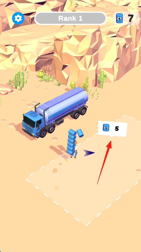 1、进入游戏后操控角色搬运蓝色油桶箭头指向5,到指定区域白线框,为后续收集作准备。