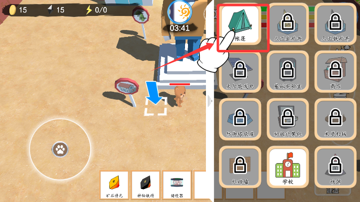 3、通过界面指引选取"帐篷"设施,按照提示完成拼装与建造。