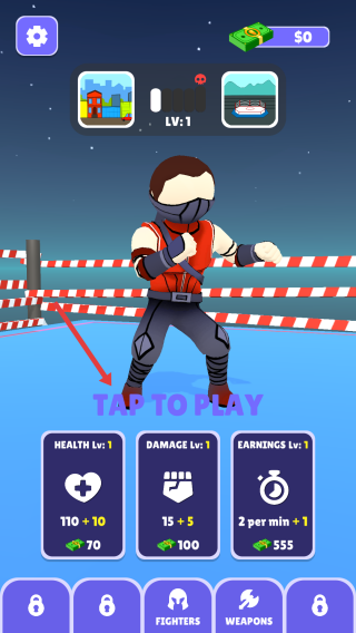 1、进入游戏,点击TAP TO PLAY,进入Idle Boxing的对战,可先升级属性提升战力。