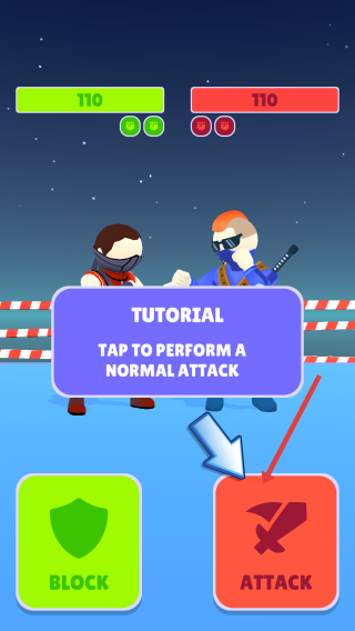 2、对战时,根据提示点击红色ATTACK按钮,执行普通攻击,打击对手积累优势。