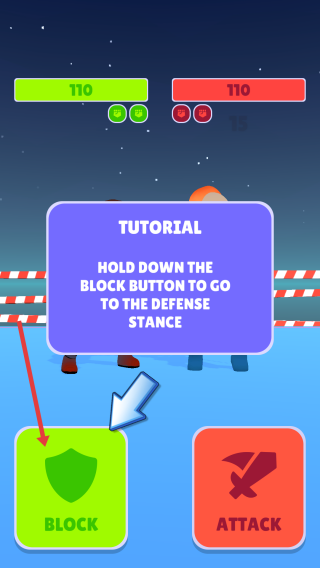 3、长按绿色BLOCK按钮,进入防御姿态,抵御敌方进攻,把握反击时机赢下战斗。