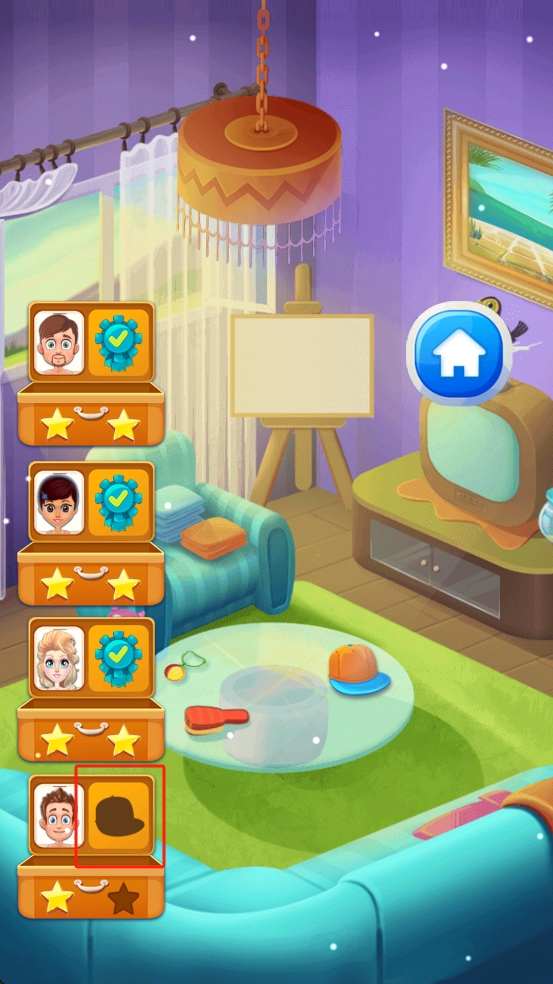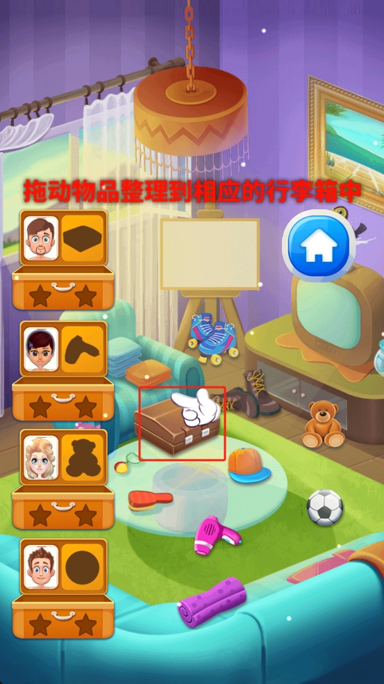 1、首先我们依据提示把左侧行李箱对应物品图案找到,再将客厅里的物品拖入匹配的行李箱,按指引操作完成分类。
