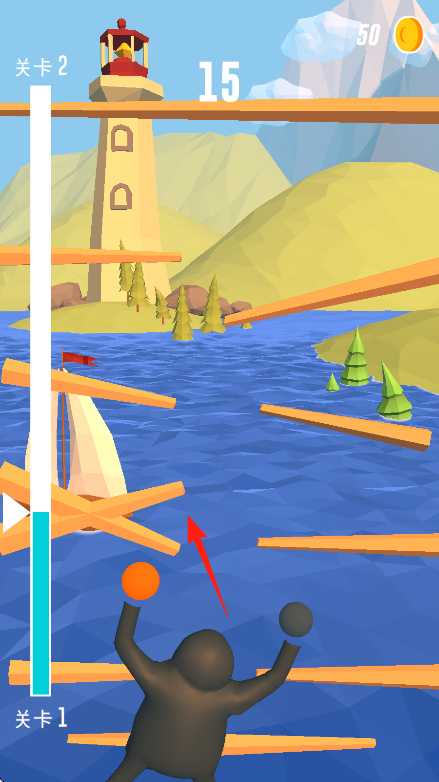 1、关卡2开始,操控黑色小人,利用橙色圆球,沿箭头指向攀爬木架,向上移动。