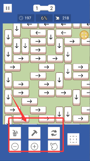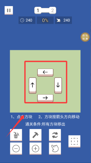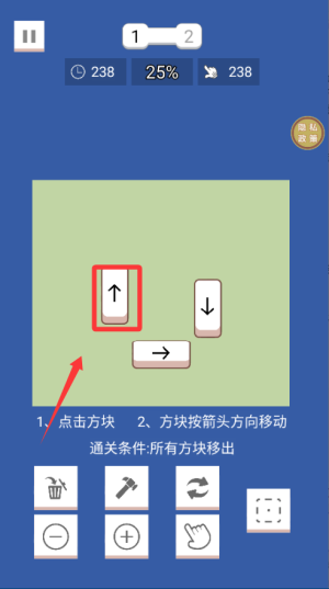 1、开局先观察箭头方块的分布情况,了解每个方块的移动方向,找出最先可以移出的突破口进行操作。