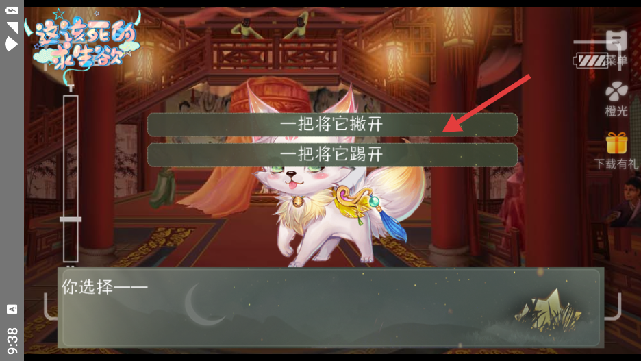 1、进入互动场景,面对灵宠出现两个动作选项,点击一把将它撇开,触发对应剧情,影响角色与灵宠的关系走向,通过操作,体验情节分支,感受互动叙事的趣味。