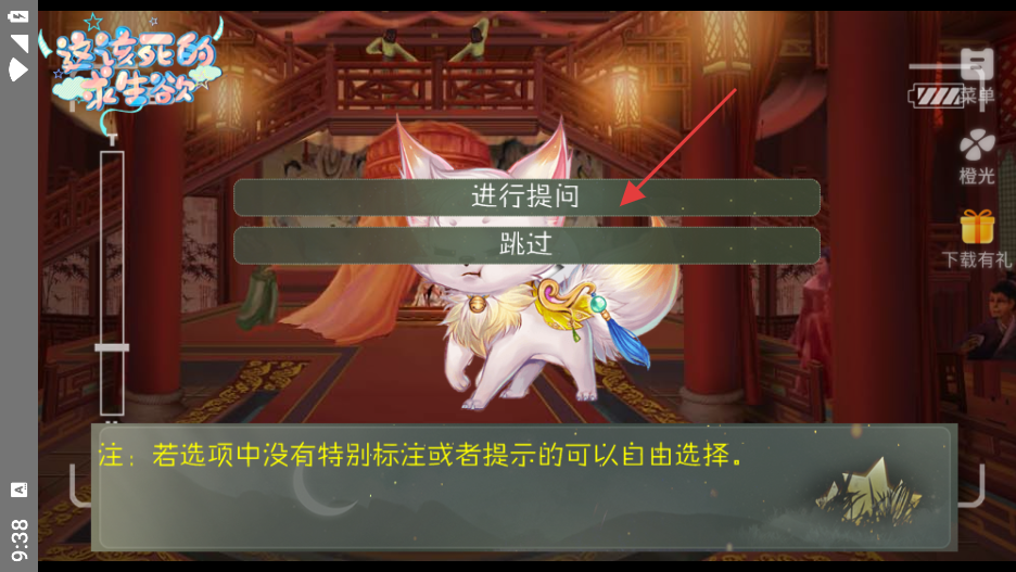 2、在灵宠互动环节,出现进行提问与跳过选项,点击进行提问,开启信息探索,利用对话互动机制,挖掘灵宠相关线索,通过操作,推进剧情信息收集,体验角色探索的过程。