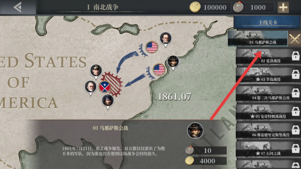 2、战役选择页选南北战争章节,点击主线关卡里的01马那萨斯会战,进入该场战役战斗。
