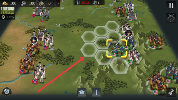 3、战斗场景中,依据箭头指引,将部队移动至指定六边形区域,部署兵力推进战役进程。