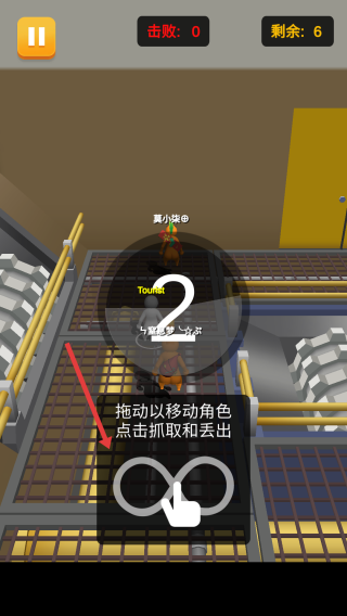 2、进入关卡,拖动下方∞形按钮移动角色,点击可抓取敌人,按提示熟悉操作,应对初始战斗。