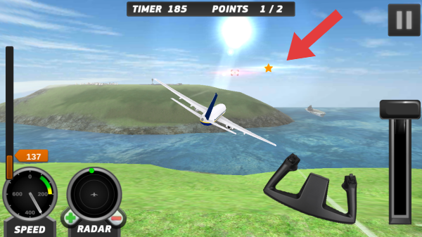 3、需要小心调整飞机方向,朝空中星星标识的目标飞行,继续收集以达成POINTS1/2的进阶目标。