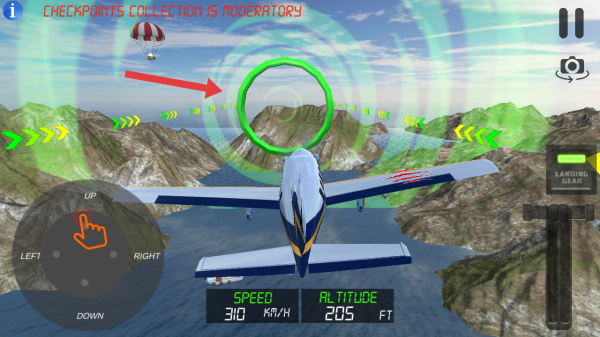 2、在游戏中操控飞机穿过绿色圆环检查点,结合左下角的按键来调整方向,遵循系统的指引。