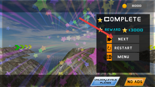 3、游戏关卡完成后,需要点击NEXT进入下一关,领取这一关的奖励并继续挑战下一关的飞行任务。