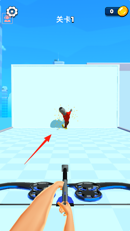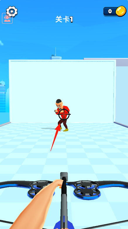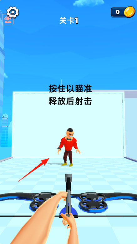 1、在关卡1,按住屏幕瞄准红箭头指向的敌人,按提示按住以瞄准释放后射击准备攻击。