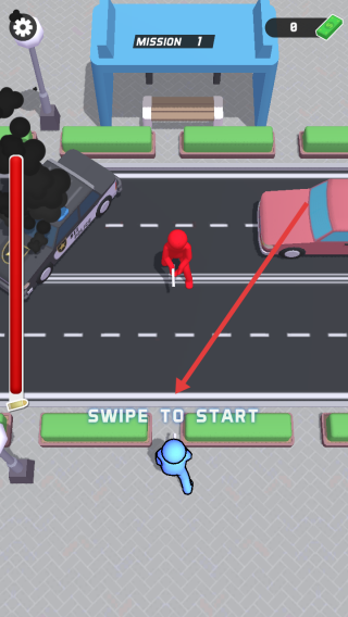 1、在MISSION1场景,于马路旁找到写有SWIPE TO START的绿地区域,滑动屏幕操控蓝色小人出发,奔赴任务点。