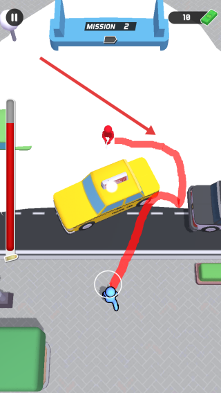 2、到MISSION2,按住屏幕拖动规划蓝色小人路线,让其沿红色轨迹绕开车辆,接近红色目标完成追踪任务。