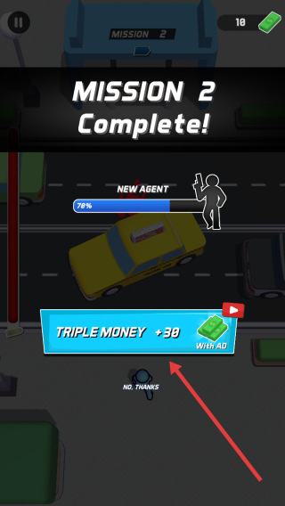 3、MISSION2通关后,若想三倍收益点TRIPLE MONEY+30WITH AD看广告,选NO,THANKS则直接解锁后续。