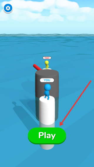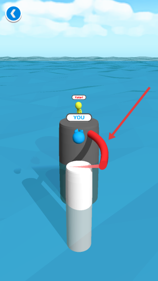 1、点击启动页Play,进入水上柱子场景,操控蓝色YOU角色,尝试借红色路径移动到上方柱子。