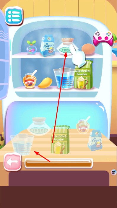 1、进入游戏,在初始界面中,从冰箱里选择需要的原材料,点击将其放置到操作台上。