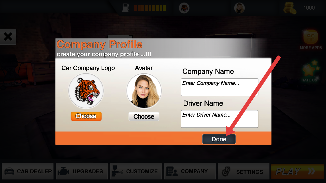 1、在公司资料创建界面,选定车标、头像,填写公司与司机名称后,点击Done的按钮,完成信息配置。