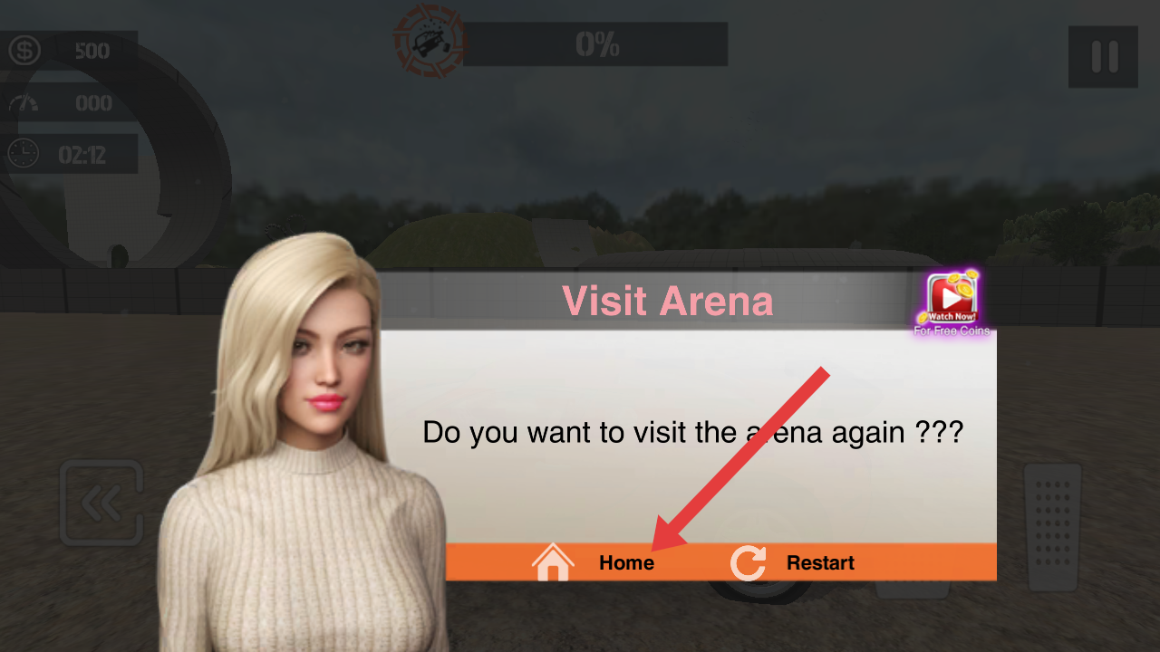 2、参观完竞技场后,面对是否重访竞技场的提示,点击Home的选项,返回游戏的主界面。