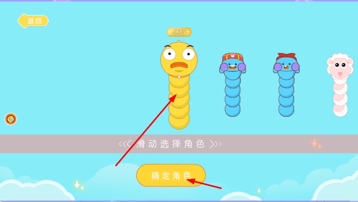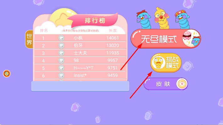 2、在主界面选择模式,无尽模式或挑战模式,还可进入皮肤界面选喜欢的贪吃蛇外观,选好后点确定角色。