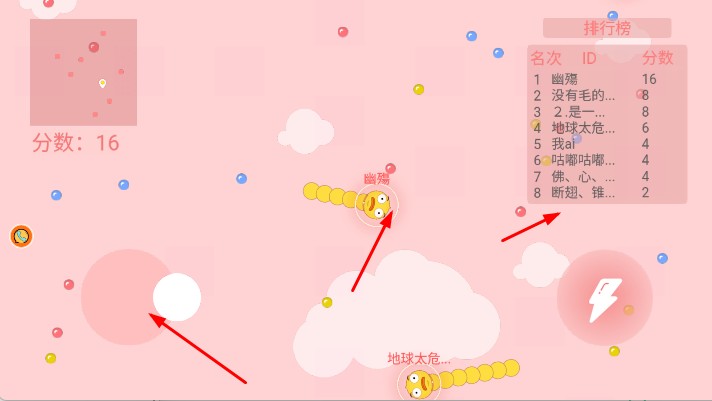 3、实时竞技对抗:多人同场匹配,排行榜实时更新分数、长度,吃球、对抗同步进行,胜负在动态对战中即时呈现,强化竞技沉浸感。