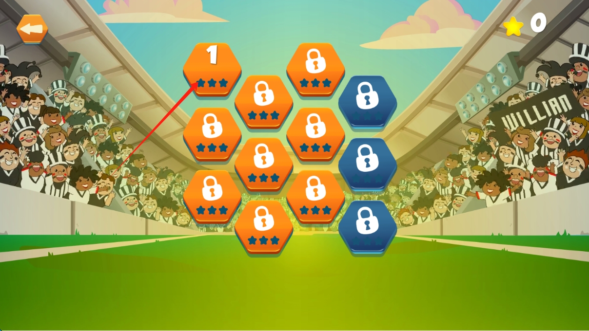 2、在关卡选择界面点击标有1的橙色关卡,进入对应足球比赛关卡,点击选择游戏关卡。