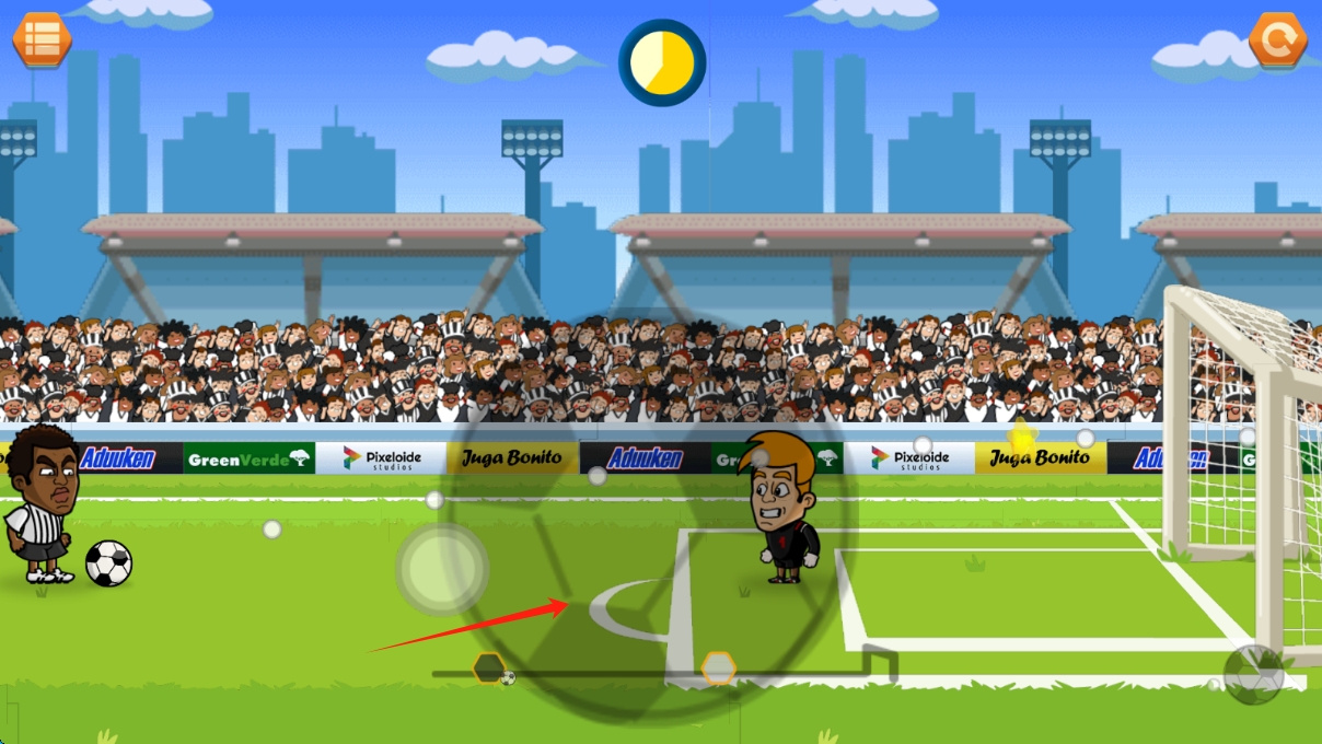 3、比赛场景中操控球员,看准时机踢球,尝试突破防守射门得分,完成关卡目标,拨动射门。