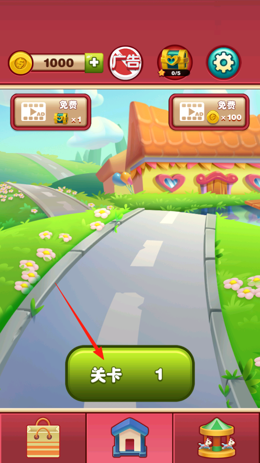 1、打开游戏主界面,看到关卡1按钮,点它进入第一关,界面上方有金币广告宝箱这些功能,先不管,专注点关卡按钮开始玩,看看第一关咋消除方块。