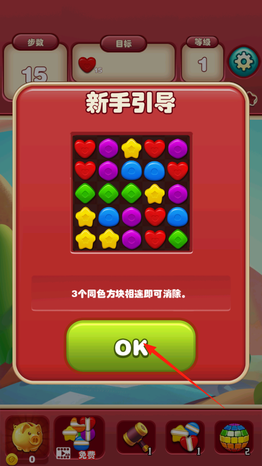 2、进入新手引导,弹出提示框,说3个同色方块相连能消除,点OK确认,然后在下面的方块堆里,找同色的,交换位置让它们连一起,完成消除,熟悉游戏规则。