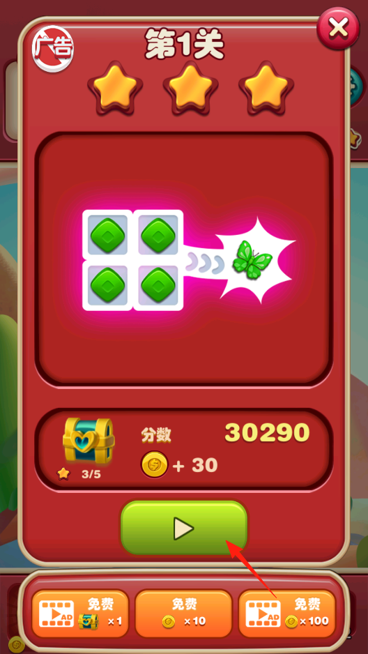 3、第一关通关后,显示得分和奖励,想再玩这关,点播放按钮重玩,想领奖励,看分数和金币到账,接着挑战下一关,争取拿更多星星和金币。