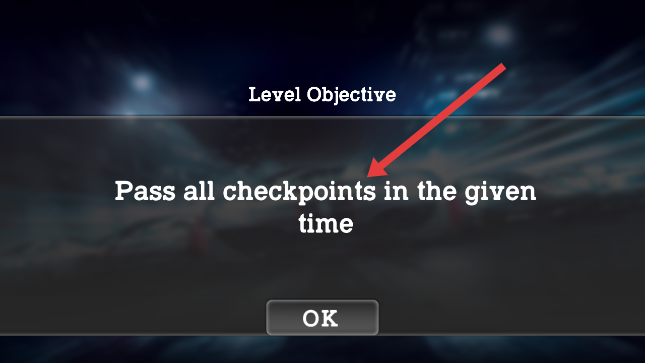 1、点击下方OK按钮,确认关卡目标Pass all checkpoints in the given time限时通过所有检查点,开启挑战。