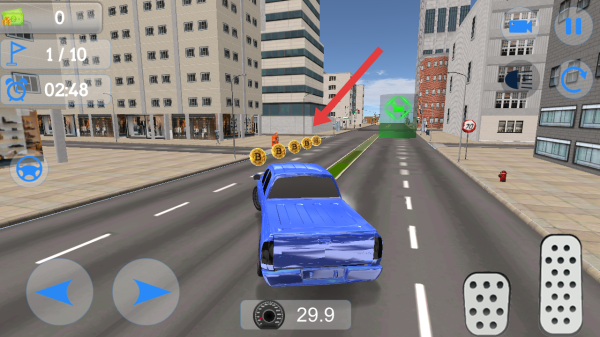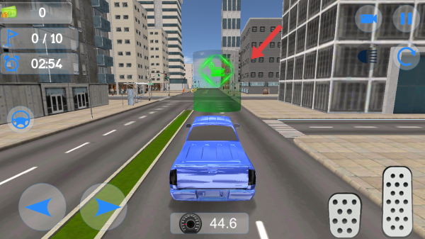 2、操控蓝色汽车,驶向前面的绿色检查点区域,触发首个检查点计数左上角0/10开始累计。